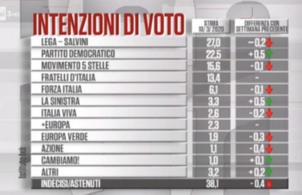 In discesa anche il M5s, al 15,6%. Fratelli d’Italia rimane stabile al 13,4%, Forza Italia in calo al 6,1% così come Italia Viva di Matteo Renzi al 2,6%. Quanto al grado di fiducia degli italiani nei leader il presidente del Consiglio Giuseppe Conte resta saldamente in testa e cresce di due punti rispetto alla scorsa settimana (42%) seguito dalla leader di Fdi Giorgia Meloni che sale al 34%, Salvini stabile al 31%, Zingaretti – a casa in quarantena dopo aver contratto il coronavirus – che recupera un punto e sale al 29% e da Luigi Di Maio, fermo al 22%. Renzi guadagna un punto e si attesta al 13%, così come Berlusconi che dal 18 arriva al 19%.