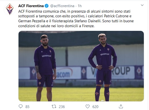 FIRENZE – Dopo Dusan Vlahovich anche altri giocatori e membri dello staff viola sono risultati positivi al coronavirus. Lo comunivca la stessa Acf Fiorentina sul sito e su Twitter: «Acf Fiorentina comunica che, in presenza di alcuni sintomi, sono stati sottoposti a tampone, con esito positivo, i calciatori Patrick Cutrone e German Pezzella e il fisioterapista Stefano Dainelli. Sono tutti in buone condizioni di salute nei loro domicili a Firenze