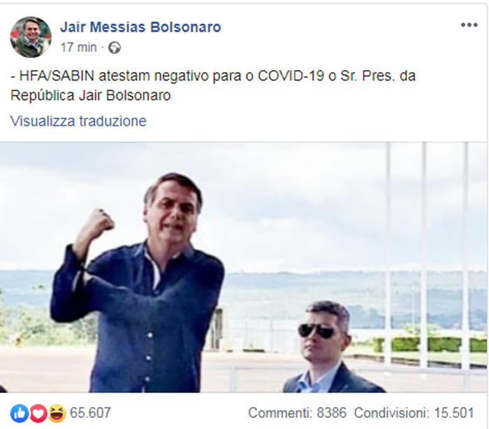 BRASILIA – Il presidente del Brasile Bolsonaro si è sottopopsto con la moglie al test per il coronavirus ed è risultato negativo: lo fa sapere lo stesso presidente brasiliano postando su Facebook una foto in cui fa il gesto dell’ombrello. Si era infatti diffusa la notizia che il presidente fosse positivo al coronavirus. La Casa Bianca stava organizzando una riunione di emergenza dopo che lo scorso weekend Trump e Bolsonaro si erano incontrati a Mar-a-Lago e il suo capo della comunicazione, Fabio Wajngarten, ha annunciato ieri di essere positivo al coronavirus, provocando preoccupazione nello staff della Casa Bianca.