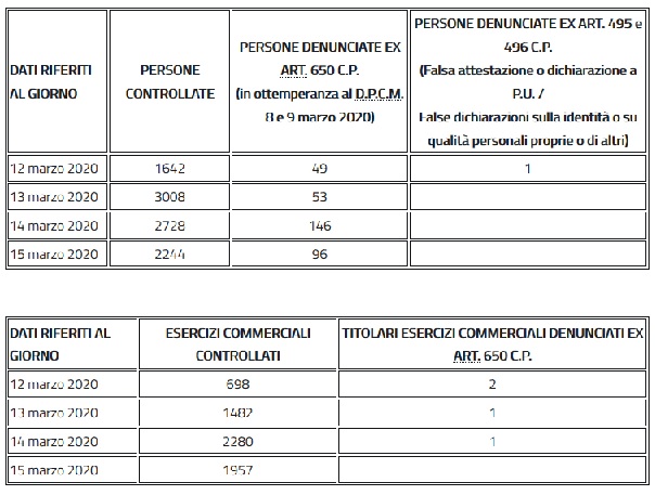FIRENZE La Prefettura, a partire da oggi pubblica quotidianamente, alle ore 15.00, sul proprio sito internet www.prefettura.it/firenze, sezione “Coronavirus” (sull’home page, lato destro) i dati relativi ai controlli svolti sul territorio metropolitano dalle forze dell’ordine e dalle polizie municipali circa il rispetto delle disposizioni per il contenimento della diffusione del virus Covid-19, previste dai decreti del Presidente del Consiglio dei Ministri dell’8, 9 e 11 marzo 2020. ecco qui sotto la prima tabella pubblicata in data odierna: