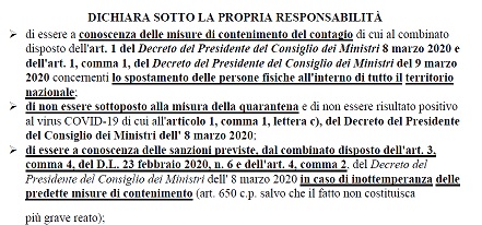«di non essere sottoposto alla misura della quarantena e di non essere risultato positivo al virus COVID-19 di cui all’articolo 1, comma 1, lettera c), del Decreto del Presidente del Consiglio dei Ministri dell’ 8 marzo 2020».