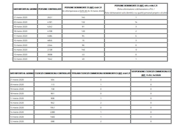 Con gli accertamenti della giornata di ieri salgono a 1.858.697 le persone controllate, in relazione alle misure per il contenimento del contagio da coronavirus, dall’11 al 21 marzo scorsi. Sono state denunciate 82.041 persone ex articolo 650 codice penale (inosservanza provvedimenti autorità) 1.943 le denunce ex articolo 495 codice penale (falsa attestazione), 910.023 gli esercizi commerciali controllati e 2.119 i titolari denunciati.