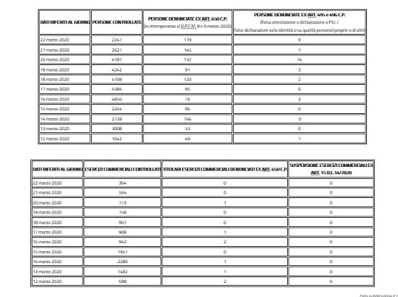 ROMA Le forze di polizia hanno controllato ieri 157.621 persone e 10.326 sono state denunciate. Gli esercizi commerciali controllati sono stati 53.776, denunciati 158 esercenti e sospesa l’attività di 7 esercizi commerciali. Salgono così a 2.016.318 – informa il Viminale – le persone controllate dall’11 al 22 marzo, 92.367 quelle denunciate per inosservanza degli ordini dell’autorità, 2.155 le denunce per false dichiarazioni; 973.799 gli esercizi commerciali controllati e 2.277 i titolari denunciati.
