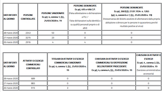 ROMA – Sono 203.011 le persone controllate ieridalle forze dell’ordine nell’ambito dei servizi per verificare il rispetto delle misure previste per contenere il contagio da coronavirus. A fornire i dati è il ministero dell’interno. Sono state sanzionate 4942 persone, 142 denunciate per false dichiarazioni e 49 sono quelle positive al coronavirus denunciate per non avere rispettato la quarantena. Gli esercizi commerciali sottoposti a controlli sono 84.941, 151 titolari di sono stati sanzionati, 12 attività sono state chiuse mentre per 10 è stata disposta la chiusura provvisoria.