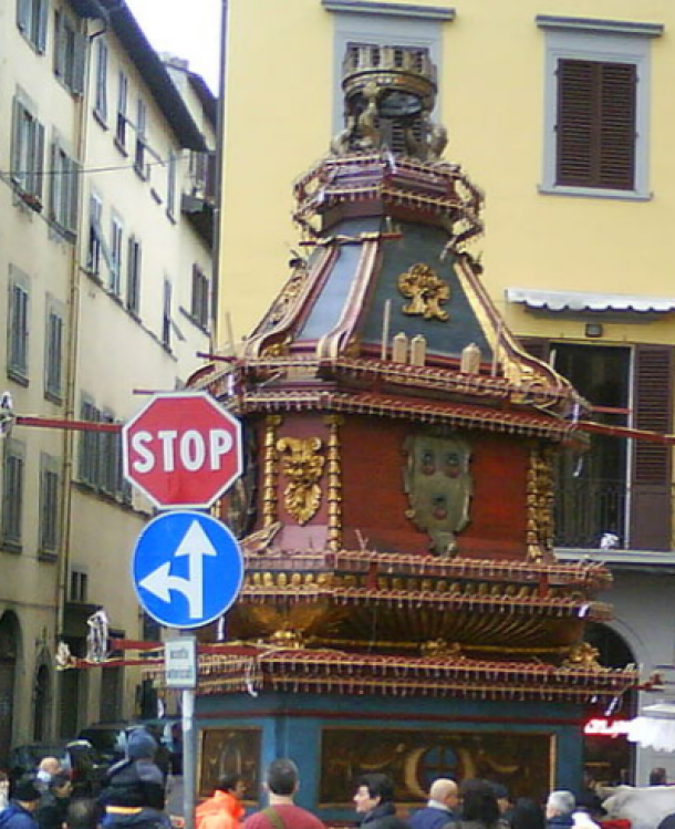 Lo Scoppio del Carro è la più antica tradizione popolare fiorentina che si tramanda da oltre 9 secoli e vuol ripercorrere le gesta dei fiorentini alle Crociate e del loro ritorno in città. Secondo la tradizione fu Pazzino de’ Pazzi, al ritorno dalla Prima Crociata, nel 1099, a riportare alcune pietre focaie del sepolcro di Cristo con le quali poi a Firenze venivano illuminate le celebrazioni del sabato