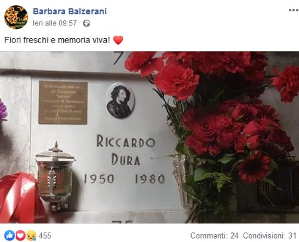 La lapide è quella di Riccardo Dura, ex brigatista della colonna genovese morto il 28 marzo del 1980 nel blitz nel covo di via Fracchia a Genova. Il post, invece, è stato scritto sulla pagina Facebook di Barbara Balzerani, ex br che ha rievocato la data, prima con un post il 28 marzo scorso che ha ricevuto in poche ore 380 like, e poi con una foto della lapide in ricordo di Dura, che si trova al cimitero genovese di Staglieno.