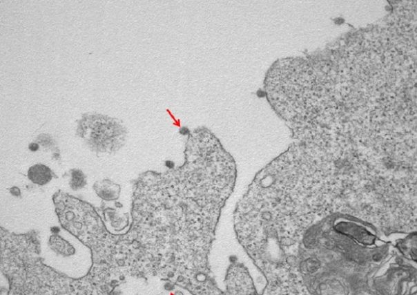 Nella prima, a un ingrandimento di 30000X, si osservano le particelle virali di SarsCov2 (indicate dalle frecce), adese alle membrane sulla superficie e all’interno di cellule utilizzate per l’isolamento.