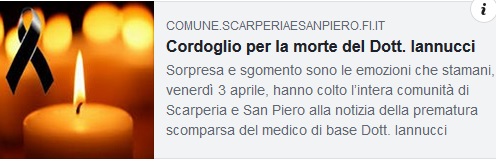 FIRENZE – C’è il primo medico vittima del coronavirus in provincia di Firenze. Si tratta del dottor Giandomenico Iannucci, che operava a Scarperia e San Piero (Firenze). Il medico di medicina generale era risultato positivo al Covid-19 a metà marzo scorso. Gli ambulatori in cui prestava servizio erano stati immediatamente sanificati e una trentina di suoi pazienti erano stati posti in isolamento, a seguito dell’indagine epidemilogica subito avviata dall’Asl. Sorpresa e sgomento sono le emozioni che stamani, venerdì 3 aprile, hanno colto l’intera comunità di Scarperia e San Piero alla notizia della prematura scomparsa del medico di base Giandomenico Iannucci, ha scritto sui social Federico Ignesti, sindaco del comune mugellano in cui operava il medico deceduto. «Ci stringiamo commossi attorno alla famiglia del dottor Iannucci ricordandolo come persona gioviale, affabile, sempre sorridente e disponibile con i suoi pazienti – ha aggiunto Ignesti – Il prezzo che stanno pagando i medici in tutta Italia è altissimo, e soprattutto i medici di famiglia, dimostrando quanto il loro ruolo rappresenti davvero quello più prossimo ai cittadini. Ci mancherà il suo lavoro e la sua professionalità – ha concluso il sindaco – ci mancherà la sua umanità»