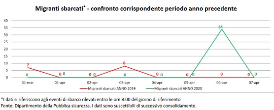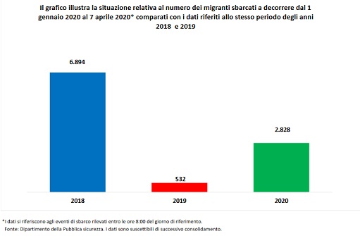 Dal cruscotto giornaliero del Ministero dell’Interno traiamo due dati significativi, riportati nelle tabelle che seguono. Innanzitutto gli sbarchi totali dal 1 gennaio al 6 aprile 2020, sono stati ben 2.828, numero infinitamente superiore rispetto a quelli del 2019 (532).