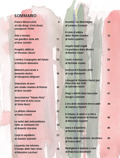 Importanti gli artisti. La copertina è dedicata a Franco Manescalchi, artista maturo e letterato affermato. Seguono l’arte sacra di Tabula Picta, le “sfumature di nero” dello studio Giambo, gli allievi dell’Accademia di Belle Arti di Bologna premiati dalla fondazione Zucchelli, i grandi pittori albanesi contemporanei, la pittrice Claudia Borgioli nel nuovo spazio mostre in piazza Santa Croce, i disegni di Fiorenzo Faorzi, il Labirinto della Masone. Si conclude con due grandi mostre: Raffaello 2020 a Milano, Modigliani a Livorno.