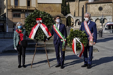 FIRENZE – Come preannunciato il sindaco Dario Nardella è stato presente alle cerimonie del 25 aprile, ma non ha seguito proprio alla lettera le indicazioni del suo Governo, visto che alle 9.30 ha deposto una corona al monumento di Piazza dell’Unità insieme ad altre due Autorità (c’erano anche il Presidente Giani e la vicepresidente Anpi provinciale, Vania Bagni), tutti con regolare mascherina. Diverso a Roma il comportamento del Presidente Mattarella, ligio alle direttive, che ha salito da solo i gradini dell’Altare della patria.