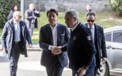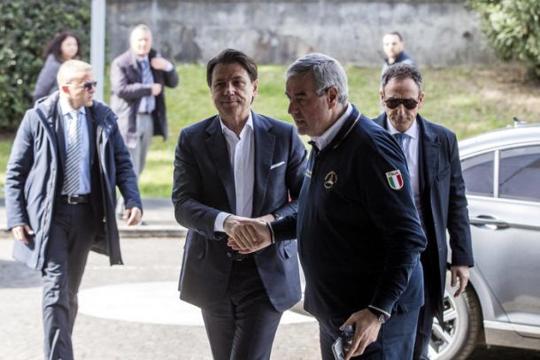 Il presidente del Consiglio Giuseppe Conte con il capo della protezione civile Angelo Borrelli, ANSA/ANGELO CARCONI