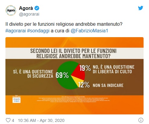 Un’altra polemica sulle recenti scelte del Governo riguarda la libertà religiosa (di cui si sono fatti portavoce, all’interno della maggioranza, gli esponenti di Italia Viva). Su questo tema, però, le notizie per il premier sono positive: lo stesso istituto EMG che aveva rilevato un certo scetticismo sulla Fase 2 (e sul lavoro dell’esecutivo) rileva anche una netta maggioranza (69%) a favore del prolungamento delle misure restrittive per ciò che riguarda le cerimonie religiose (vedi rilevazione qui sopra).