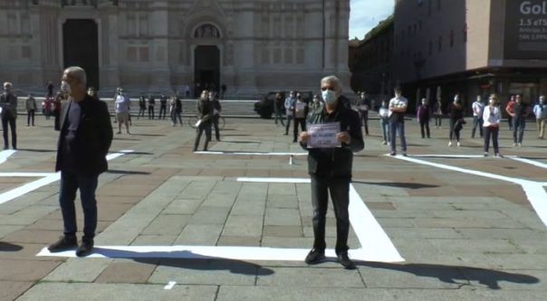 BOLOGNA – Partita con un tamtam su Facebook come simbolica ‘riunione di condominio contro le misure restrittive imposte dal Governo’, ha attirato diverse decine di persone una manifestazione di protesta organizzata in mattinata a Bologna, nella centralissima Piazza Maggiore. I partecipanti, fra i quali commercianti, professionisti e diversi ex politici di destra, si sono radunati sul ‘crescentone’, tutti con mascherine e a distanza di sicurezza, esibendo cartelli con indicati articoli della Costituzione.