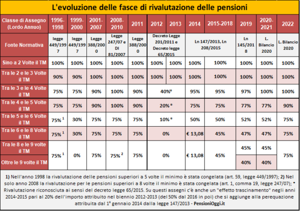 Dal 1° gennaio 2014, la legge 147/2013, ha introdotto un sistema di rivalutazione suddiviso in cinque scaglioni prorogato poi dalla legge 208/2015 sino al 31 dicembre 2018. Per le pensioni di importo fino a tre volte il trattamento minimo l’adeguamento avviene in misura piena (100%); per le pensioni di importo superiore e sino a quattro volte il trattamento minimo viene riconosciuto il 95% dell’adeguamento; per quelle di importo superiore e sino a cinque volte il minimo l’adeguamento è pari al 75%; adeguamento che scende al 50 % per i trattamenti pensionistici complessivamente superiori a cinque volte il minimo e al 45% per i trattamenti superiori a 6 volte il trattamento minimo inps.