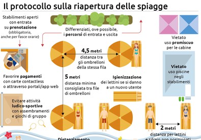Negli stabilimenti con prenotazione – Stabilimenti aperti con entrata su prenotazione , ombrelloni distanziati di almeno cinque metri, piscine chiuse e igienizzazione dei lettini se si danno a un nuovo utente. «Per consentire un accesso contingentato agli stabilimenti balneari e alle spiagge attrezzate si legge in una nota dell’Inail – viene suggerita la prenotazione obbligatoria, anche per fasce orarie. Si raccomanda, inoltre, di favorire l’utilizzo di sistemi di pagamento veloci con carte contactless o attraverso portali/app web. Vanno inoltre differenziati, ove possibile, i percorsi di entrata e uscita, prevedendo una segnaletica chiara. Per garantire il corretto distanziamento sociale in spiaggia – prosegue – la distanza minima consigliata tra le file degli ombrelloni è pari a cinque metri e quella tra gli ombrelloni della stessa fila a quattro metri e mezzo. È opportuno anche privilegiare l’assegnazione dello stesso ombrellone ai medesimi occupanti che soggiornano per più giorni. In ogni caso è necessaria l’igienizzazione delle superfici prima dell’assegnazione della stessa attrezzatura a un altro utente, anche nel corso della stessa giornata. È da evitare, inoltre, la pratica di attività ludico-sportive che possono dar luogo ad assembramenti e giochi di gruppo e, per lo stesso motivo, deve essere inibito l’utilizzo di piscine eventualmente presenti all’interno dello stabilimento».