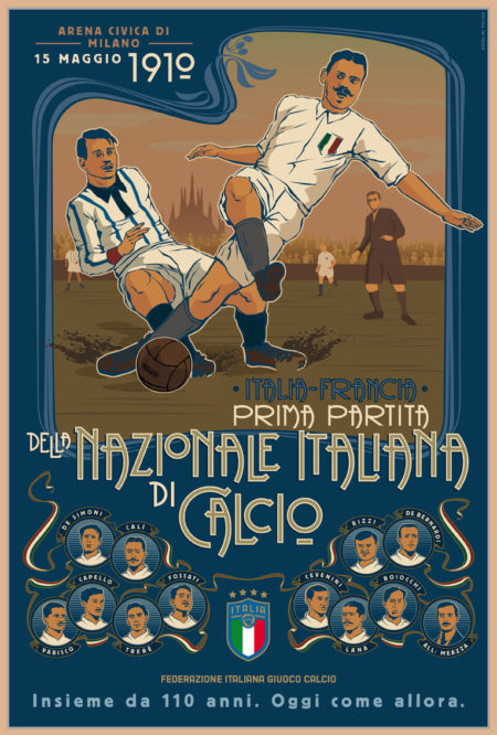 Proprio il primo successo sui francesi, festeggiato dai 4000 spettatori sugli spalti dell’impianto milanese, è rievocato nella campagna della FIGC per celebrare l’anniversario della Nazionale attraverso lo slogan Insieme da 110 anni. Oggi come allora, con le immagini dei protagonisti di quella storica partita. Il visual realizzato da Carlo Angelini, illustra un momento della partita Italia – Francia e le icone dei 12 pionieri (11 calciatori più l’allenatore Umberto Meazza) della Nazionale. Il font, disegnato ad hoc per l’occasione, così come i particolari delle divise dei giocatori, sono frutto di una ricerca tra le fonti iconografiche dell’epoca e contribuiscono a evocare tutto il fascino di un’epoca lontana nel tempo, ma ancora viva nel nostro immaginario.