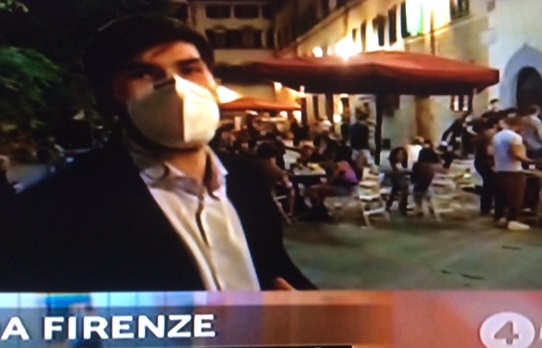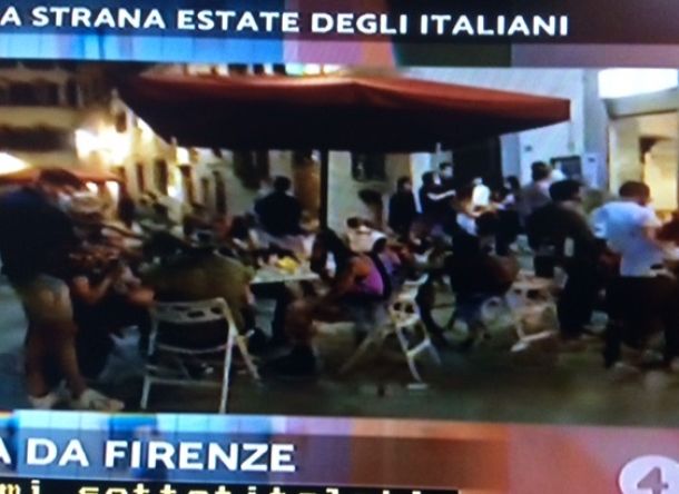 Abbiamo invece fotografato, dalle immagini di Rete 4, le scene riprese in Piazza Santo Spirito, invasa da giovani e meno giovani, alcuni senza mascherine, altri che non rispettavano la distanza di sicurezza, ma con alcuni locali che avevano ben organizzato la distribuzione del pubblico in tavoliesterni, con posizionamento che costringeva quasi al rispetto delle regole. Tutt’altra cosa rispetto alla situazione di Roma.