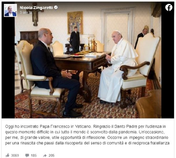 VATICANO – Papa Francesco ha ricevuto il segretario del Pd, nonché Presidente della regione Lazio, Nicola Zingaretti. Ne ha dato notizia la santa Sede e, correttamente, solo dopo questo annuncio, anche il segretario Pd ha informato tutti su facebook di questo suo incontro. «Oggi ho incontrato Papa Francesco in Vaticano.Ringrazio il Santo Padre per l’udienza in questo momento difficile in cui tutto il mondo e’ sconvolto dalla pandemia. Un’occasione,per me, di grande valore, utile opportunita’ di riflessione. Occorre un impegno straordinario per una rinascita che passi dalla riscoperta del senso di comunita’ e di reciproca fratellanza». Questa la conclusione di Zingaretti dopo l’approfondita discussione con il Pontefice.