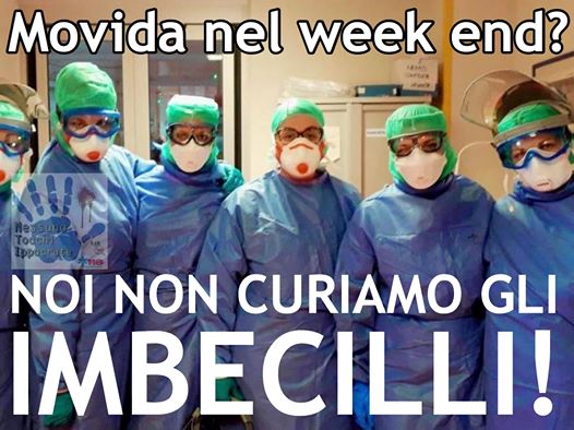 «In tutta Italia si sono registrati assembramenti davanti ai locali della movida del sabato sera…..per colpa di qualcuno retrocederemo alla FASE 1? Noi non curiamo gli imbecilli!», è il post di ‘Nessuno tocchi Ippocrate’, associazione da anni impegnata contro il fenomeno della violenza ai danni dei camici bianchi. Una provocazione, spiegano, per scuotere le coscienze dei giovani, per dire loro che i medici cureranno sempre tutti ma è assurdo farsi artefici di nuovi contagi per incuranza. Spopola anche il post di Carlo Serini, rianimatore all’ospedale San Carlo di Milano: «Io faccio l’anestesista rianimatore per tutti, belli e brutti, bianchi e neri, grandi e piccoli, Italiani e stranieri, insomma non si guarda (giustamente) in faccia a nessuno. Ma non faccio l’anestesista rianimatore per i cretini. Cari cretini, eliminatevi come preferite che fate un favore all’umanitá… Ma non chiedeteci ancora – scrive – di rivedere e rivivere i tre mesi appena trascorsi, a causa del vostro cretinismo. Io sono in terapia del sonno per sedare e sopire incubi, insonnie e risvegli dopo tre mesi in un ospedale Covid: e voi che fate? L’aperitivo… Cretino é una diagnosi (e oggi arriva gratis), non un insulto», conclude