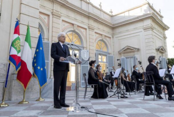 Cosi’ il presidente della Repubblica, Sergio Mattarella, dai Giardini del Quirinale ha aperto le celebrazioni per la Festa della Repubblica. Un 2 giugno diverso dal solito,senza la tradizionale parata militare ai Fori Imperiali e con un concerto, quello appena concluso, senza pubblico per l’Orchestra del Teatro dell’Opera di Roma, diretta dal maestro Daniele Gatti,con musicisti distanziati, muniti mascherina e con solo la presenza di archi.