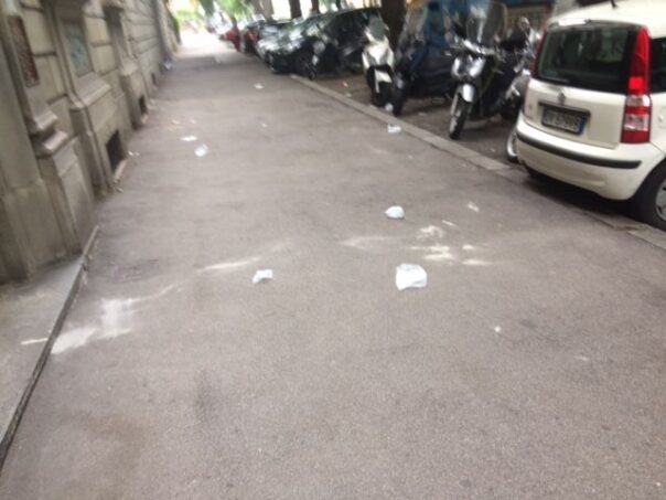 Parlavamo dunque del senso civico della gente, un esempio dell’assoluta mancanza lo notiamo dai residui di oggetti di protezione gettati in quantità sui marciapiedi da chi li ha utilizzati e poi se ne è disfatto senza gettarli nei cestini dei rifiuti, tanto ci penseranno gli addetti alla raccolta. Ma intanto lo spettacolo indecoroso che certifichiamo con le foto scattate sabato nella zona Don Minzoni – Masaccio parla da solo: guanti in quantità industriale gettati sul marciapiede e addirittura mascherine usate abbandonate presumibilmente da chi, sceso dall’auto, le ha gettate per terra (il cestino è a distanza di un metro) all’uscita del parcheggio.