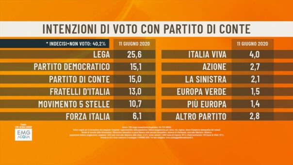 ROMA – Si parla da qualche tempo dell’intenzione di Conte di farsi un suo partito, seguendo l’esempio di Monti (risultato catastrofico) sull’onda della popolarità conquistata con le apparizioni mediatiche e con il bavaglio messo a opposizioni e parlamento. I risultati dell’ultimo sondaggio Emg Acqua proposto ad Agorà su Rai 3, nel quale si ipotizza la quota del partito di Conte, sono impressionanti. Il sondaggio infatti riguarda le intenzioni di voto con l’eventuale e ipotetico partito di Conte, di cui si continua a parlare e che Palazzo Chigi, innervosendo il Pd, continua a non smentire.