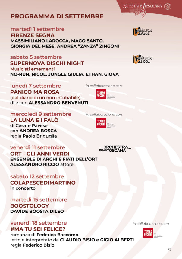 Due le serate in collaborazione con Music Pool: martedì 1 settembre «Firenze segna» con Massimiliano Larocca, Mago Santo, Giorgia Del Mese, Andrea “Zanza” Zingoni, e sabato 5 settembre Supernova Dischi Night con musicisti emergenti come No-run, Nicol, Jungle Giulia, Ethan, Giova.