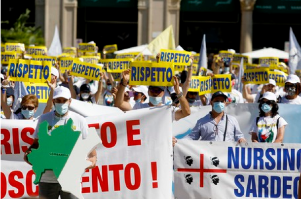 Un grande striscione giallo campeggia in piazza Duomo con la scritta ‘Rispetto’. E’ quello che chiedono centinaia di infermieri e professionisti della sanità, come tecnici radiologi, tecnici di laboratorio, ostetriche, che si sono radunati, a distanza di sicurezza, in piazza a Milano per chiedere al governo più risorse per la categoria, soprattutto dopo quello che ha dovuto affrontare con l’emergenza Covid. La manifestazione nazionale è stata promossa dal sindacato nazionale della categoria Nursing Up. Gli infermieri sono scesi in piazza con tamburi, fischietti e scandiscono lo slogan “mai più come prima”, provengono da tutta Italia ma soprattutto dal centro nord e hanno deciso di manifestare a Milano, capoluogo della Regione più colpita da Covid. Durante la manifestazione è stato dedicato un minuto di silenzio alle vittime del virus, tra di loro ci sono stati anche infermieri. “Chiediamo al governo, che durante l’emergenza ci chiamava eroi, la creazione di fondi dedicati alla professione infermieristica – ha spiegato Antonio De Palma, Presidente Nursing Up, Sindacato Infermieri Italiani – che consentano di incrementare gli stipendi di almeno 500 euro al mese in via strutturale. Non chiediamo premi perché siamo professionisti ma i nostri stipendi devono essere allineati ameno alla media degli stipendi europei. I nostri sono i più bassi d’Europa”.