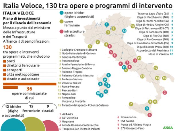 Italia veloce: E’ il piano delle infrastrutture e dei tarsporti per un’Italia ad Alta velocità. Interventi per ferrovie, porti, aeroporti, autostrade e strade, ciclovie. 40 programmi prioritari e 66 programmi d’intervento.