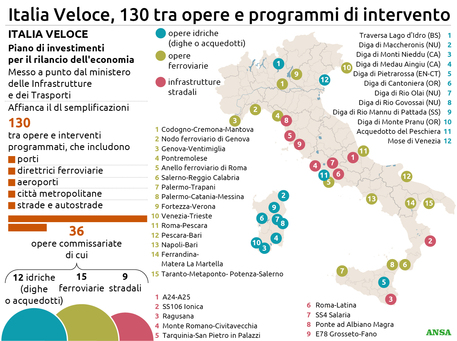ROMA – Nel corso della conferenza stampa dopo il consiglio dei ministri notturno il premier, dopo aver affermato che «le opere pubbliche non si bloccheranno più perché i procedimenti amministrativi saranno con sentenza breve e le stazioni appaltanti procederanno anche in presenza di contenzioso», ha messo a disposizione le slides che indicano tutte le opere, in particolare le 130 considerate strategiche, che saranno sbloccate e avranno un iter breve di realizzazione. Mettiamo a disposizione le slides per ogni settore d’intervento: