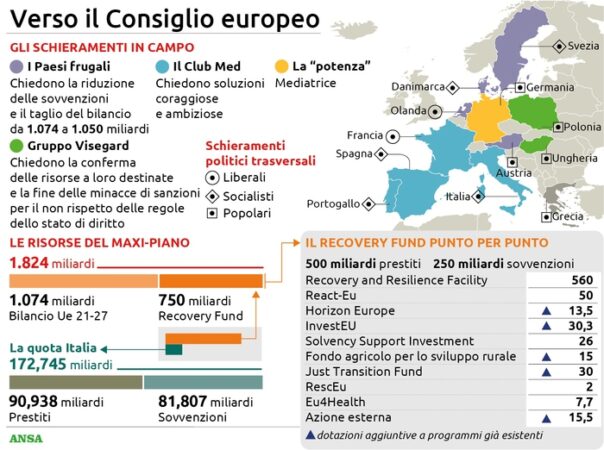 BRUXELLES – E’ battaglia al vertice Ue su tre elementi principali: la governance; il volume e l’equilibrio tra sussidi e prestiti del Recovery Fund; e le correzioni al Bilancio 2021-2027. Si apprende da fonti diplomatiche europee. Sono state presentate varie opzioni per la riduzione del tetto del Bilancio e dei sussidi (190 miliardi) che compongono la parte di Recovery Fund suddiviso per programmi (quindi per il momento non ci sono tentativi di tagliare la Resilence and Recovery Facility da 560 miliardi, 310 miliardi di trasferimenti a fondo perduto e 250 miliardi di prestiti, che costituisce il perno della proposta).