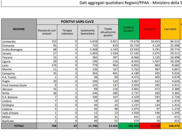 ROMA – In Italia, dall’inizio dell’epidemia di coronavirus, almeno 248.070 persone (+239 rispetto a ieri, +0,1%; ieri +295) hanno contratto il virus Sars-CoV-2. Di queste 35.154 sono decedute (+8; ieri +5) e sono state dimesse 200.460 (+231, +0,1%; ieri +255). Attualmente i soggetti positivi dei quali si ha certezza sono 12.456 (-1; ieri +35); il conto sale a 248.070 se nel computo si aggiungono anche i morti e i guariti, conteggiando cioè tutte le persone che sono state trovate positive al virus dall’inizio dell’epidemia. I pazienti ricoverati con sintomi sono 708 (+3, +0,4%; ieri -11), di cui 42 (-1, -2,3%; ieri +2) in terapia intensiva.