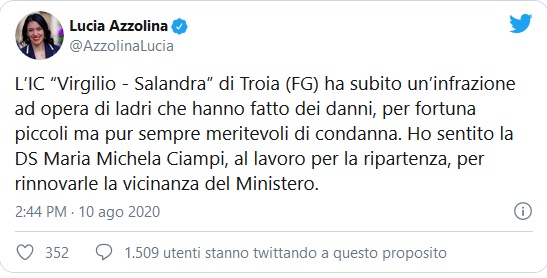 Nuova gaffe dell’Azzolina: furto in una scuola, lei scrive infrazione ad opera dei ladri. Il web si scatena