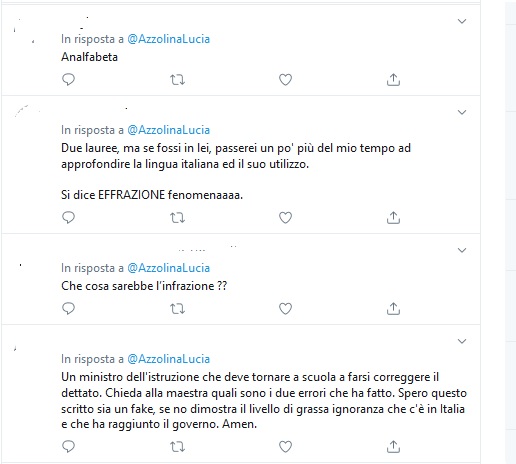 ROMA – La ministra Lucia Azzolina ne ha combinato un’altra delle sue, scatenando la reazione furiosa del web, che sottolinea il clamoroso errore. La ministra dal fiammante rossetto, annunciando il furto subito da una scuola del comune di Troia – in provincia di Foggia – ha commesso un errore sbagliando la parola. Invece di utilizzare il termine corretto, effrazione, ha parlato di «un’infrazione ad opera di ladri». Sono in tantissimi ad averle fatto notare l’errore sotto il post, rimarcando che nel suo ruolo di ministra dell’Istruzione sarebbe bene non commettere certi strafalcioni.