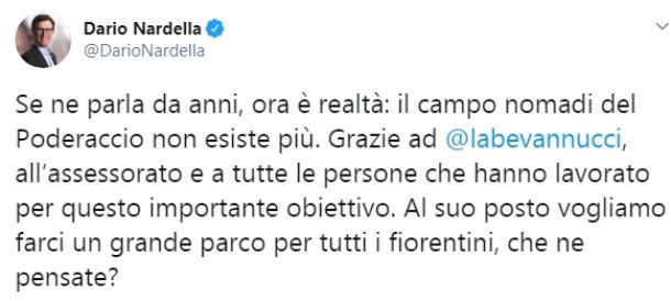 «Credo che a sinistra – ha aggiunto – sia possibile affrontare problemi come questi senza lasciarli alla propaganda ideologica di partiti che usano il tema dei campi rom solo per fare campagna elettorale». Nardella ha ricordato che «non abbiamo avuto bisogno dell’uso della forza pubblica, e per questo ringrazio la polizia municipale che stando sempre un passo indietro ci ha supportato: abbiamo utilizzato gli strumenti e le regole che valgono per tutti i cittadini, nessuna corsia preferenziale, nessun vantaggio, ma regole e strumenti che noi mettiamo a disposizione di tutte le persone che hanno determinate condizioni sociali. Questo è un modello vincente, è il modello Firenze che credo debba essere utilizzato in tutto il paese, perché questi problemi di immigrazione e di integrazione non si possono sempre tirar fuori in campagna elettorale per gli scontri tra i partiti, e anche per la sinistra smantellare e sgomberare un campo rom non deve essere un tabù, anzi, è un esercizio di grande responsabilità e intelligenza».
