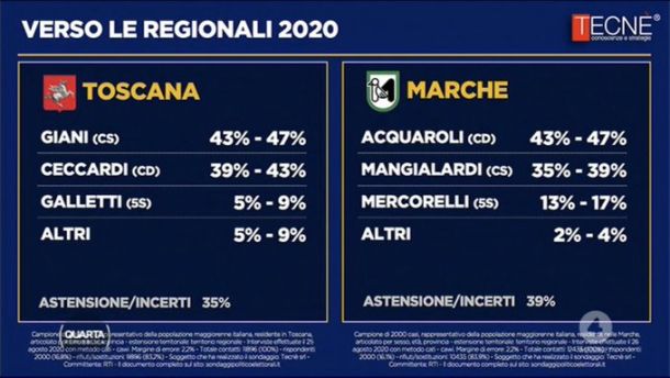 In Puglia Raffaele Fitto è tra 39 e 43%, il governatore uscente Michele Emiliano tra il 36 e il 40% (le defezioni di M5s e Italia Viva pesano). Nelle Marche il meloniano Acquaroli, espressione del centrodestra, è davanti con buon margine (43-47%) su Mangialardi del centrosinistra (35-39%) e il distacco è di fatto allargato dalla corsa separata del grillino Mercorelli. La chiave principale del confronto la si avrà in Toscana: Giani è ancora in vantaggio (43-47%) ma non di molto sulla leghista Ceccardi (39-43%).