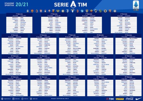 MILANO – La serie A parte il 19 settembre con Benevento-Inter (posticipata), Fiorentina-Torino, Genoa-Crotone, Juventus-Sampdoria, Lazio-Atalanta (posticipata), Milan-Bologna, Parma-Napoli, Sassuolo-Cagliari, Udinese-Spezia, Hellas Verona-Roma. Si è appena concluso il sorteggio del campionato di serie A in diretta streaming sui canali della Lega.