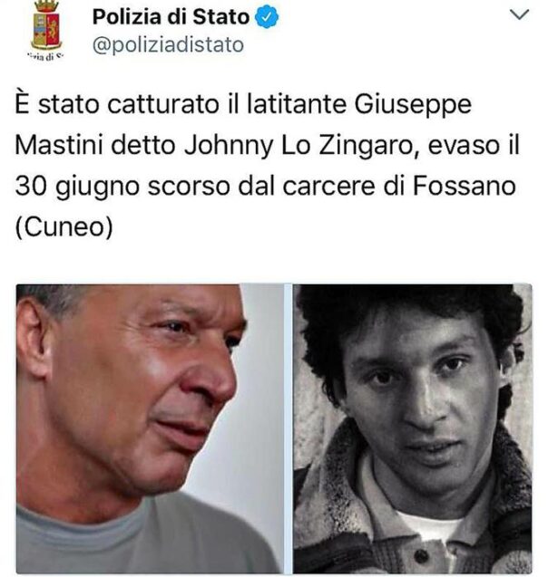 “L’evaso Giuseppe Mastini, conosciuto come Johnny ‘lo zingaro’, è stato rintracciato e catturato grazie al lavoro congiunto svolto dal Nucleo Investigativo Centrale della Polizia Penitenziaria e dalla Polizia di Stato. A loro va il mio più sentito ringraziamento”.Lo scrive in un tweet il ministro della Giustizia Alfonso Bonafede.