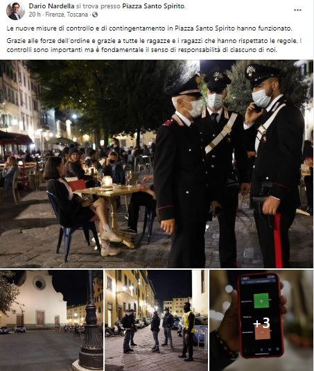Il sindaco Nardella su Facebook afferma: «Le nuove misure di controllo e contingentamento in Piazza Santo Spirito hanno funzionato. Grazie alle Forze dell’ordine e a tutte le ragazze e i ragazzi che hanno rispettato le regole. I controlli sono importanti, ma è fondamentale il senso di responsabilità di ciascuno di noi».