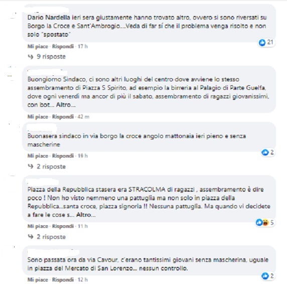 Non l’avesse mai detto!, subito il suo profilo Facebook è stato subissato da commenti di persone che hanno criticato aspramente, come risulta dallo shot screen che riproduciamo qui sotto (abbiamo cancellato simboli e nomi per ragioni di privacy). Molti segnalavano che il problema non è stato risolto, ma solo spostato. Assembramenti di giovani e meno giovani senza mascherina segnalati soprattutto a Borgo la Croce, Piazza Sant’Ambrogio, San Lorenzo, via Cavour, Piazza della Repubblica. La movida sembra incontenibile, nonostante gli sforzi encomiabili delle Autorità. Salvato Santo Spirito, si aprono altri fronti, succede così in tutte le città.