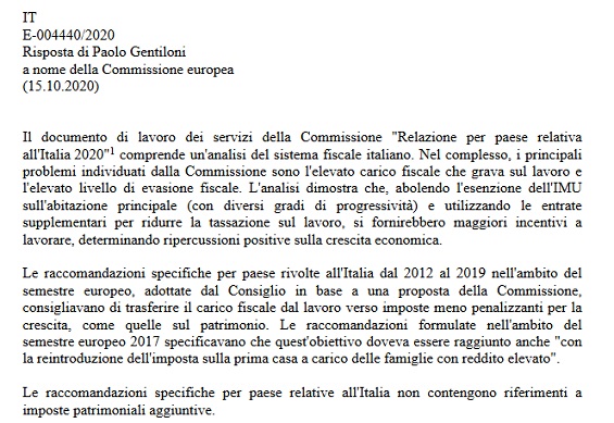 La risposta di Gentiloni ha confermato le intenzioni comunitarie: «L’analisi dimostra che, abolendo l’esenzione dell’Imu sull’abitazione principale (con diversi gradi di progressività) e utilizzando le entrate supplementari per ridurre la tassazione sul lavoro, si fornirebbero maggiori incentivi a lavorare, determinando ripercussioni positive sulla crescita economica».