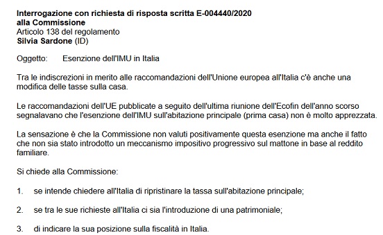 L’Europarlamentare della lega, Silvia Sardone, ha rivolto un’interrogazione a Gentiloni nella quale chiedeva tre cose: «Se intende chiedere all’Italia di ripristinare la tassa sull’abitazione principale. Se tra le sue richieste all’Italia ci sia l’introduzione di una patrimoniale. E, infine, di indicare la sua posizione sulla fiscalità in Italia».