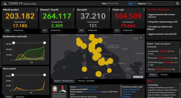 ROMA – Il bollettino della protezione civile di oggi 24 ottobre riporta altri 151 i morti per coronavirus in Italia nelle ultime ventiquattro ore (37.210 da inizio pandemia) e 19.644  nuovi contagi, in totale finora oltre 504.000 casi. Sono 1.128 le terapie intensive, 2.309 i guariti, in totale 264.117.