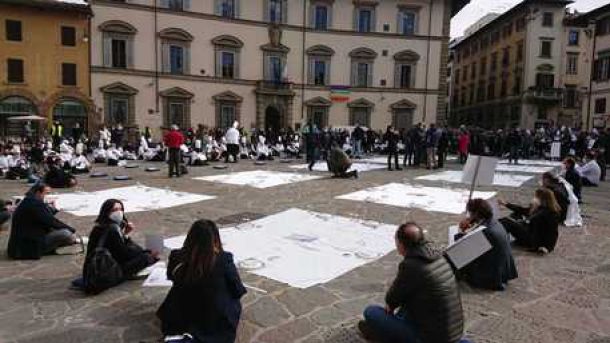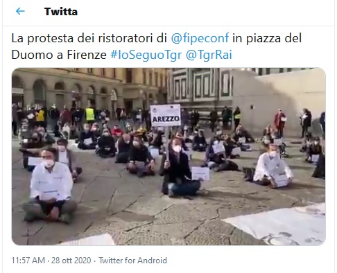 In Piazza del Duomo a Firenze è in corso un sit in, davanto a Palazzo Sacrati Strozzi, sede della Giunta regionale, di ristoratori di tutta la Toscana, distanziati e con le mascherine, che non causano alcun disturbo al traffico o ai passanti. Speriamo che le autorità di pubblica sicurezza siano più di buon senso di quelle romane e nonintervengano con cariche a fumogeni o idranti, ma conoscendole crediamo proprio di sì.