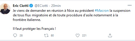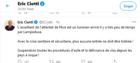 NIZZA – Un deputato, Consigliere dipartimentale delle Alpi Mrittime, Eric Ciotti, che appartiene al partito les Républicains, ha scritto su twitter che l’autore del terribile attentato che ha causato tre morti, era sbarcato poco tempo fa a Lampedusa.