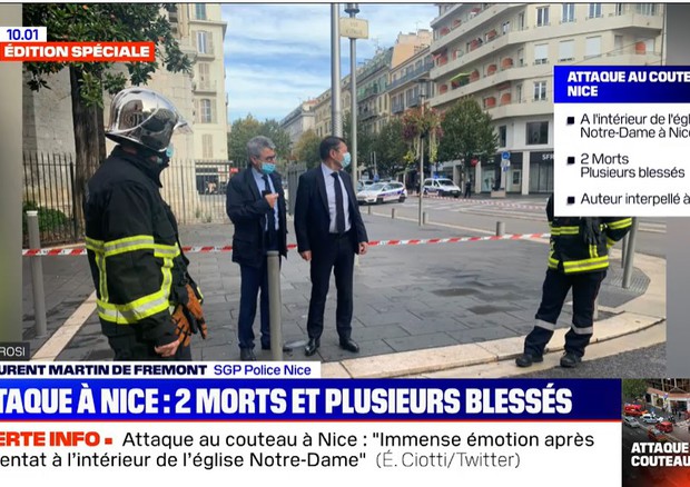 Le vittime, ha riferito, sono una donna di 60 anni, trovata vicino all’ingresso con una ferita alla gola così profonda da essere quasi una decapitazione, un 55enne che svolgeva le funzioni di sacrestano, anche lui colpito alla gola, e una donna di 44 anni, deceduta per le numerose ferite da taglio dopo essere fuggita in un vicino ristorante.