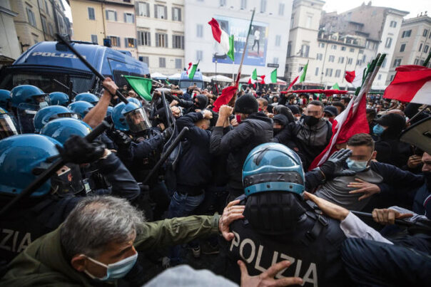 ROMA – Tensione, spintoni e tafferugli tra forze dell’ordine e manifestanti, al sit-in delle ‘Mascherine tricolori’, movimento sovranista vicino a CasaPound, organizzato in piazza Campo de’ Fiori a Roma per dire No a un nuovo lockdown e alle misure dell’ultimo dpcm. Secondo quanto si apprende da fonti di polizia, tutto è nato quando alcuni manifestanti volevano muoversi dalla piazza.