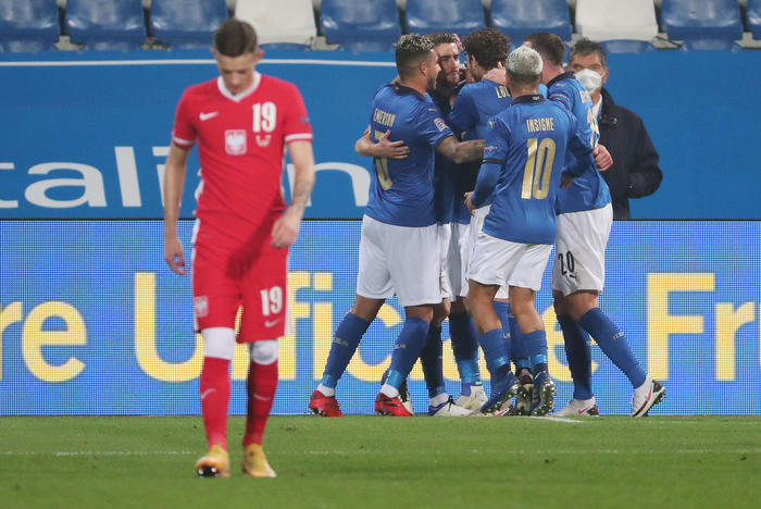 REGGIO EMILIA – Missione compiuta, da parte di un’Italia assai rimaneggiata da coronavirus e infortuni. Ma la vittoria contro la Polonia è stata afferrata alla fine di una partita dominata nettamente dagli azzurri. Andati in vantaggio con Jorginho nel primo tempo e col raddoppio, nella ripresa, di Berardi, che giocava nello stadio che lo vede protagonista col Sassuolo. Italia in testa al girone, scavalcata l’Olanda. Ora dovrà cercare di vincere anche contro la Bosnia, nella sfida di mercoledì 18 novembre a Sarajevo per essere sicura di arrivare prima e ospitare le finali di Nations League. Hanno sofferto un po’, gli azzurri, fra un gol e l’altro, perchè la Polonia, venuta chiaramente per ottenere il pareggio, dopo essere andata sotto ha cercato di rimediare. Ma l’Italia, che aveva segnato anche un altro gol con Insigne, giustamente annullato, ha saputo resistere. Dopo un primo tempo, come detto, chiuso con un vantaggio meritato e quel gol di Jorginho su rigore giustamente concesso per una cintura netta, in area, subiìta da Belotti.
