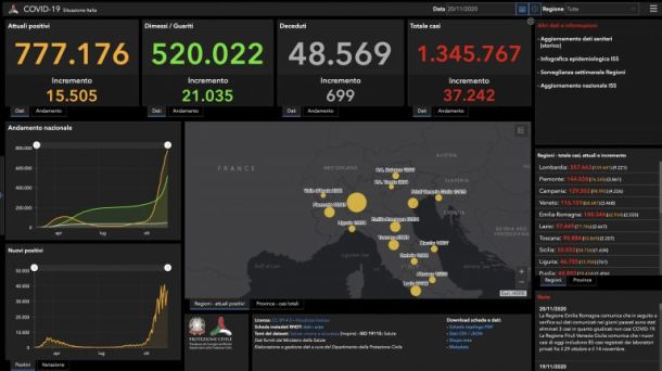 Coronavirus, bollettino del 20 novembre: 699 morti (totale 48.569), 37.242 nuovi contagi, 3.748 terapie intensive
